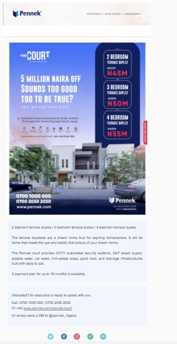 Pennek, a distinguished real estate company in the USA and Nigeria, entrusted us with various projects. We were tasked with managing email marketing, design and branding, content marketing, paid advertising, Google Ads, and ad strategy.